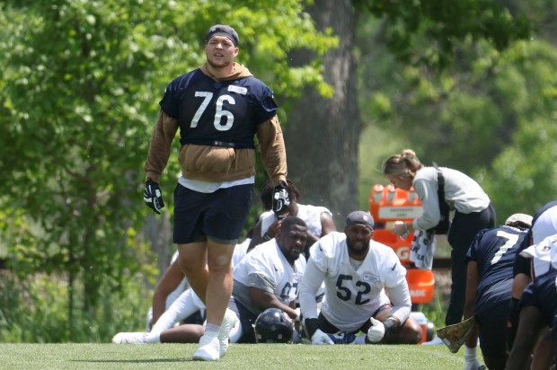 Bears offensive linemen Jake Curhan (73) and Larry Borom (75) work out during OTAs at Halas Hall on May 23, 2024. (Brian Cassella/Chicago Tribune)Bears offensive lineman Matt Pryor (79) works out during OTAs at Halas Hall on May 23, 2024. (Brian Cassella/Chicago Tribune)Bears guard Bill Murray (60) works out during OTAs at Halas Hall on May 23, 2024. (Brian Cassella/Chicago Tribune)
