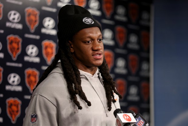 Chicago Bears special teams coordinator Richard Hightower answers questions from the media following OTAs at Halas Hall on Friday, May 31, 2024. (Chris Sweda/Chicago Tribune)Chicago Bears linebacker Tremaine Edmunds (49) answers questions from the media following OTAs at Halas Hall on Friday, May 31, 2024. (Chris Sweda/Chicago Tribune)Chicago Bears running back D’Andre Swift (4) answers questions from the media following OTAs at Halas Hall on Friday, May 31, 2024. (Chris Sweda/Chicago Tribune)