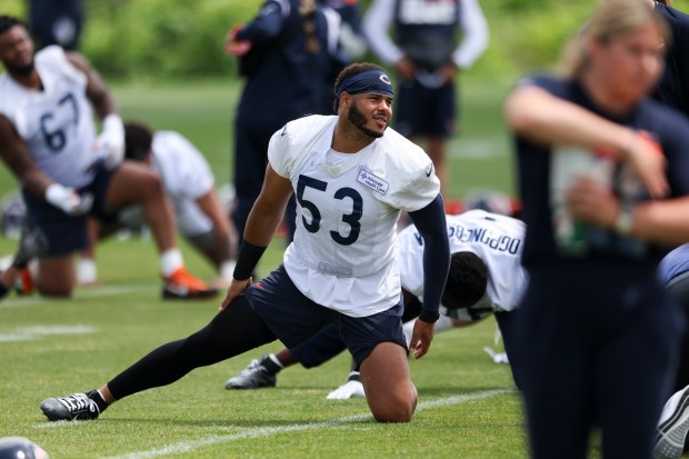 Chicago Bears linebacker T.J. Edwards (53) stretches during minicamp at Halas Hall in Lake Forest on June 5, 2024. (Eileen T. Meslar/Chicago Tribune)Chicago Bears quarterback Caleb Williams (18) during minicamp at Halas Hall in Lake Forest on June 5, 2024. (Eileen T. Meslar/Chicago Tribune)Chicago Bears quarterback Caleb Williams (18) during minicamp at Halas Hall in Lake Forest on June 5, 2024. (Eileen T. Meslar/Chicago Tribune)
