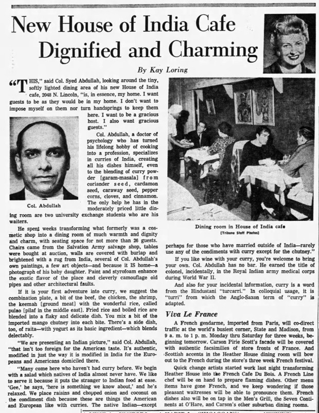 Before this, Sen had believed the earliest Chicago Indian restaurant was House of India. First opened in 1963 at 2048 N. Lincoln , the restaurant was run by Colonel Syed Abdullah and his wife. The Tribune wrote frequently about Abdullah and his success, but the man’s life holds some mysteries like Smile. Abdullah claimed to be an Oxford-trained psychologist.