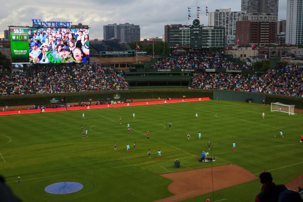 The scoreboard is set for the Chicago Red Stars game against Bay FC at Wrigley Field on June 8, 2024. (Eileen T. Meslar/Chicago Tribune)Chicago Red Stars forward Mallory Swanson (9) holds her head after losing to Bay FC at Wrigley Field on June 8, 2024. (Eileen T. Meslar/Chicago Tribune)
