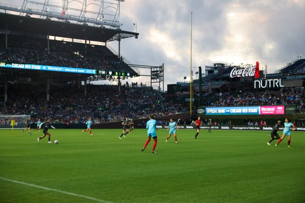 Chicago Red Stars midfielder Leilanni Nesbeth, left, gets past Bay FC’s Alyssa Malonson on June 8, 2024, at Wrigley Field. (Eileen T. Meslar/Chicago Tribune)Fans watch the Chicago Red Stars warm up before their game against Bay FC on June 8, 2024, at Wrigley Field. (Eileen T. Meslar/Chicago Tribune)Chicago Red Stars players warm up before their game against Bay FC on June 8, 2024, at Wrigley Field. (Eileen T. Meslar/Chicago Tribune)