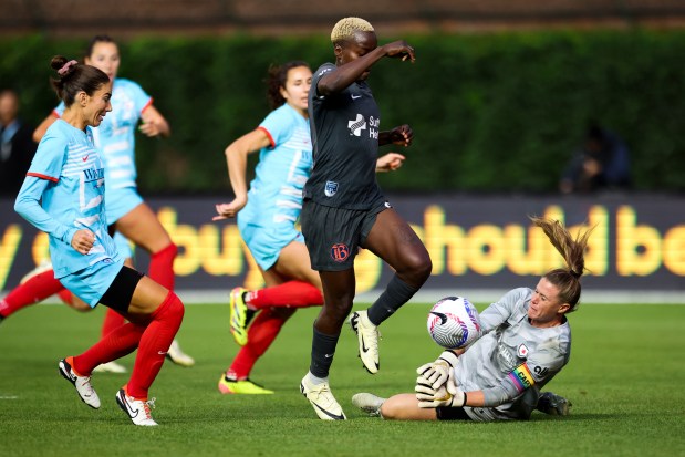 Bay FC goalkeeper Katelyn Rowland makes a save during the game against the Chicago Red Stars at Wrigley Field on June 8, 2024. (Eileen T. Meslar/Chicago Tribune)Chicago Red Stars defender Tatumn Milazzo (23) tackles Bay FC’s Joelle Anderson during their game at Wrigley Field. (Eileen T. Meslar/Chicago Tribune)Bay FC goalkeeper Katelyn Rowland makes a save during the game against the Chicago Red Stars at Wrigley Field on June 8, 2024. (Eileen T. Meslar/Chicago Tribune)